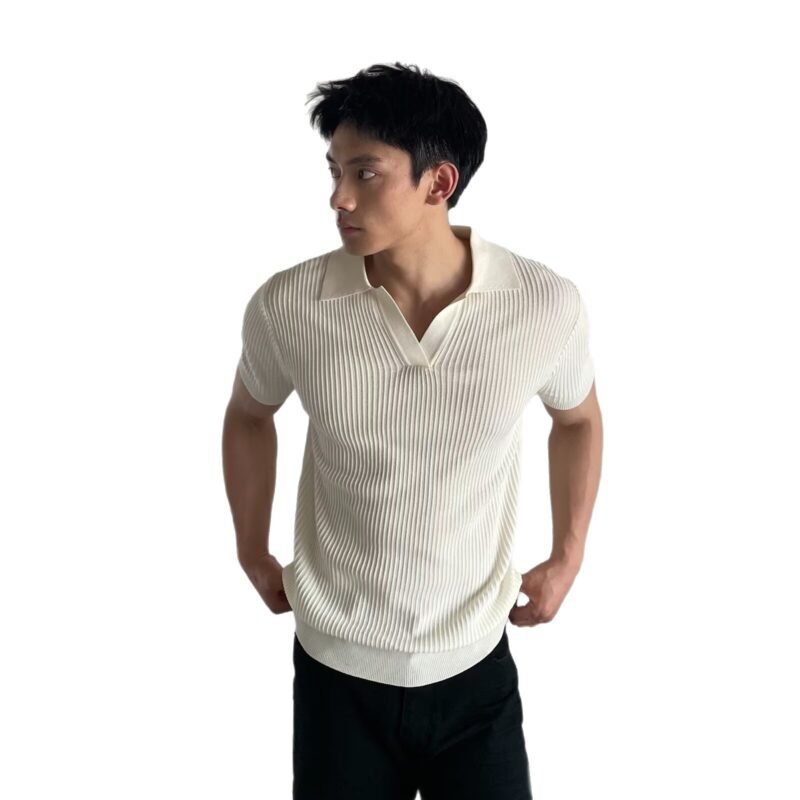 V-neck Slim-fit Lapel-striped Short-sleeve Knit