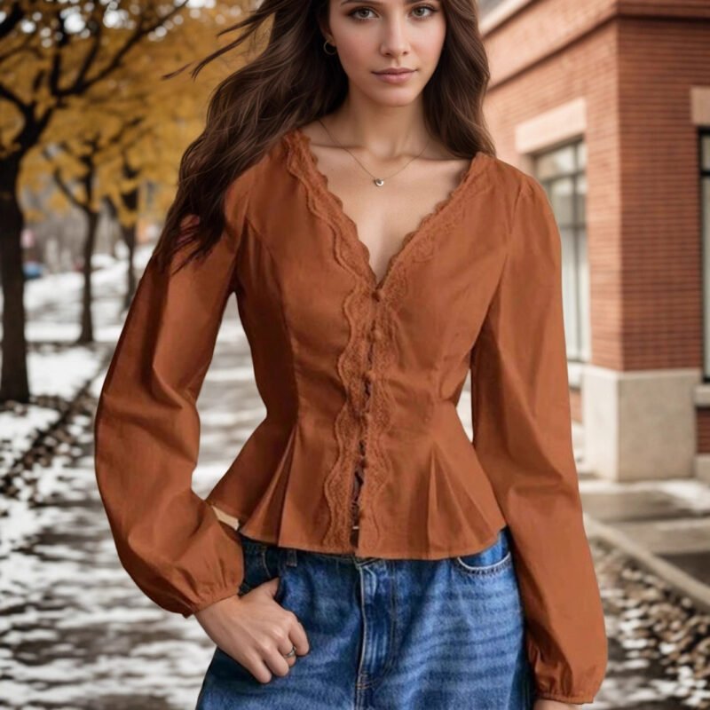 Lace-trimmed Long-sleeve Shirt With Multiple Buttons